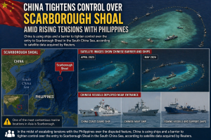 In the midst of escalating tensions with the Philippines over the disputed feature, China is using ships and a barrier to tighten control over the entry to Scarborough Shoal in the South China Sea, according to satellite data acquired by Reuters. One of the most contentious marine locations in Asia is Scarborough.