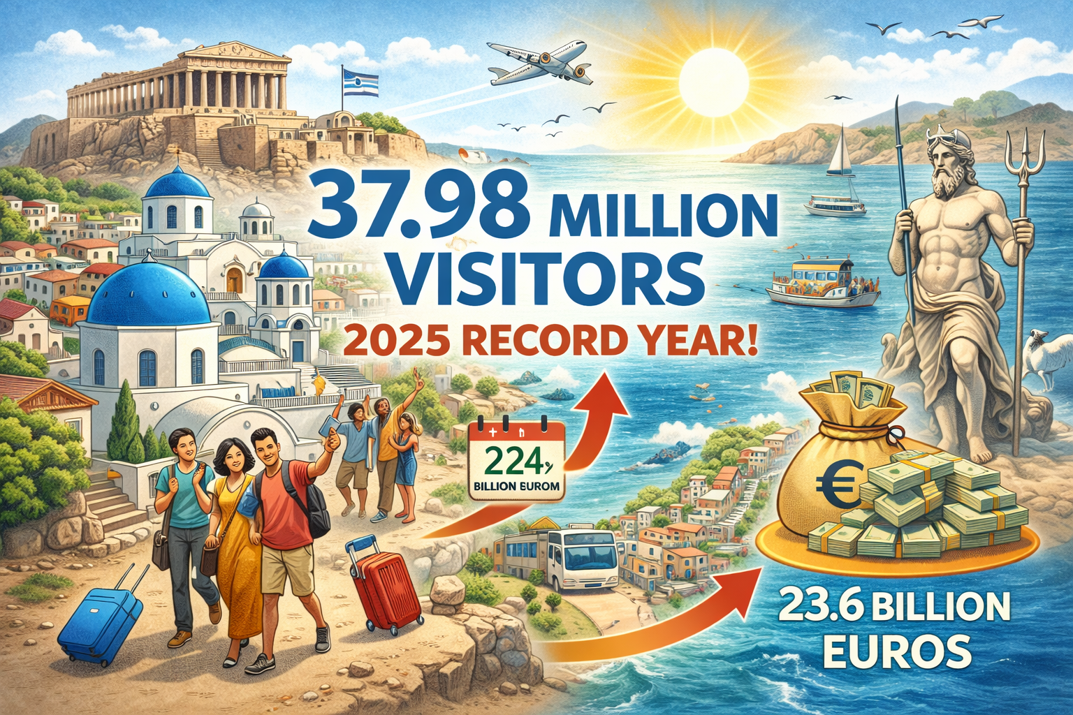 According to the central bank, Greece achieved a new tourism record in 2025 with 37.98 million visitors, up 5.6% from 35.95 million in 2024. Revenue from tourism increased to 23.6 billion euros.