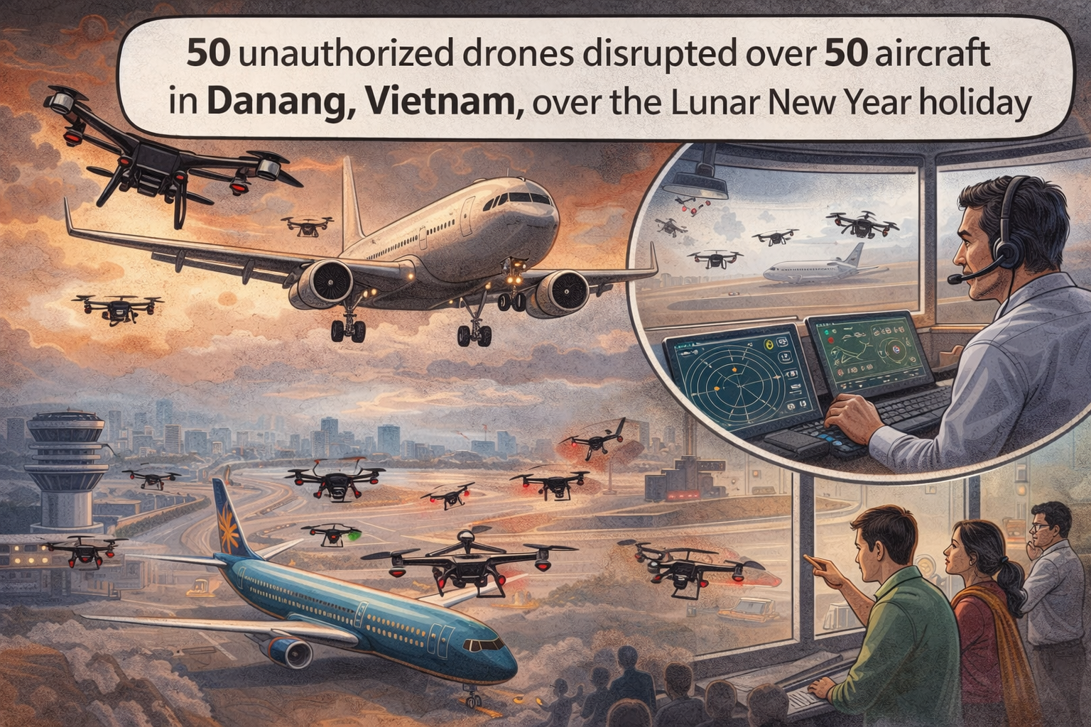 50 unauthorized drones interfered with over 50 aircraft in Danang, Vietnam over the Lunar New Year holiday at an international airport. Authorities saw drones flying near planes in two different occasions last week, which resulted in flight delays or holding patterns.