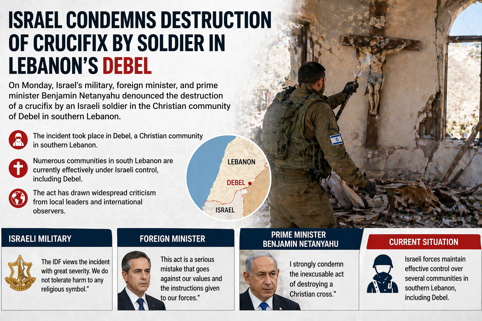 On Monday, Israel’s military, foreign minister, and prime minister Benjamin Netanyahu denounced the destruction of a crucifix by an Israeli soldier in the Christian community of Debel in southern Lebanon. Numerous communities in South Lebanon are currently effectively under Israeli control, including Debel.