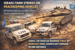An Israeli tank struck peacekeeping vehicles on Sunday in the southern region of the nation, according to the United Nations Interim Force in Lebanon (UNIFIL). “Israel Defense Forces (IDF) soldiers rammed UNIFIL vehicles with a Merkava tank twice today, causing significant damage in one instance,” the statement claimed.