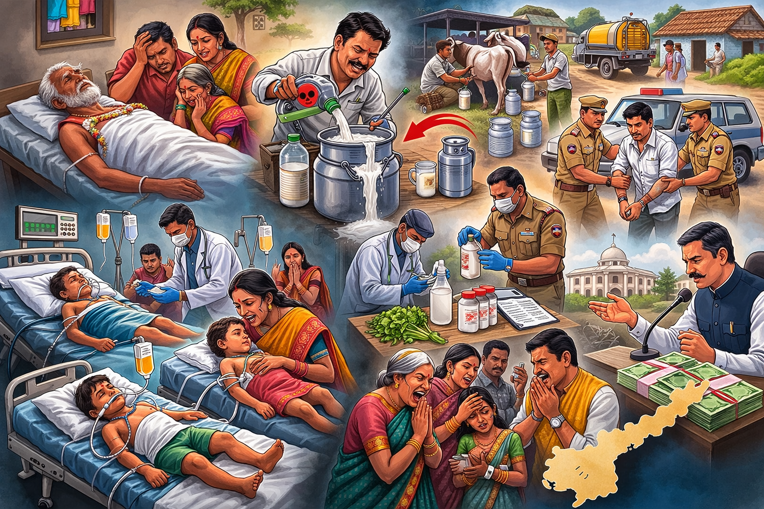 Rajamahend-ravaram city in Andhra Pradesh, four elderly individuals died from severe renal (connected to the kidney or its function) failure after drinking adulterated milk. 12 individuals were ill after consuming adulterated milk from seller Addala Ganeswara Rao, who purchased milk from 46 dairy farmers and gave it to 106 households, according to officials. Three toddlers under the age of four are among the eight victims who are critically ill due to anuria (it is a medical emergency because waste products build up in the body when kidneys stop working properly). The seller has been arrested by the authorities, who have also sent cow fodder and blood samples from 73 impacted families for forensic analysis. Opposition politicians called for severe action on food safety violations, while the chief minister pledged ₹10 lakh in compensation for each grieving family.