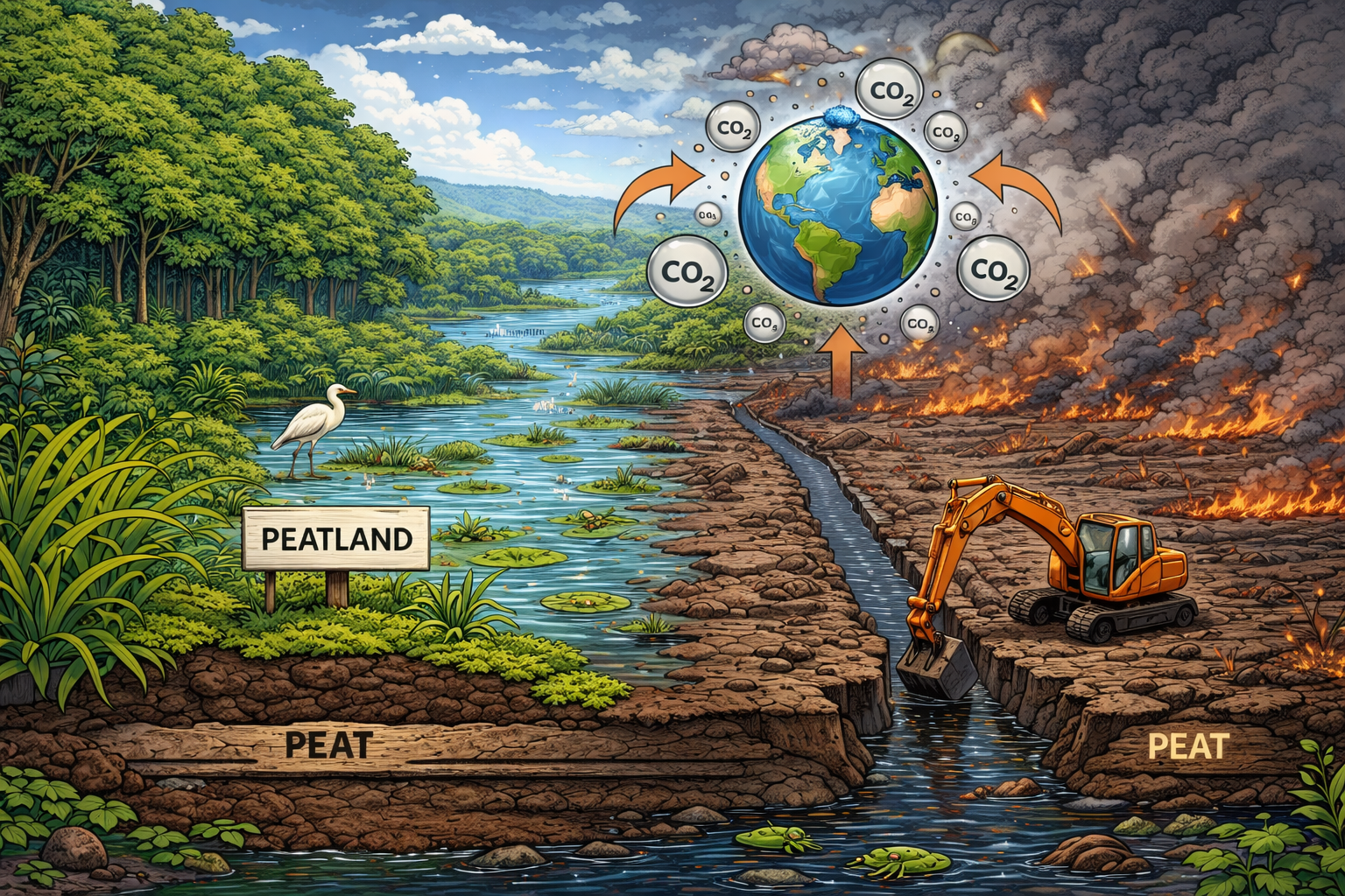 A region of land containing layers of accumulated, decomposing organic surface material—known as peat—is called a peatland. Peat grows when t here is a lot of water present. At least 5% of the world’s greenhouse gas emissions are thought to be caused by peatland draining and fires, which contribute to climate change.