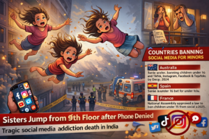 Nishika (16), Prachi (14), and Pakhi (12) minor sisters jumping from the balcony ninth- floor, Ghaziabad Uttar Pradesh for parents had restricted access to mobile phones.