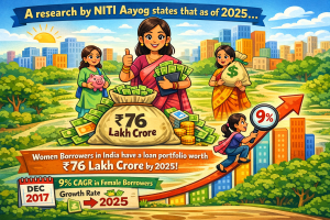 A research study by NITI Aayog states that as of 2025, women borrowers in India have a loan portfolio worth 76 lakh crore. According to the report, the compound annual growth rate of credit-active female borrowers was 9% between December 2017 and 2025.