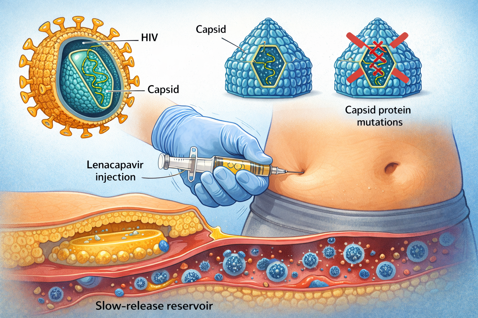 The structure that shields the virus’s RNA from the environment is called the capsid. The majority of capsid protein mutations may prevent HIV from invading cells. Once every six months, lenacapavir—the first capsid-based HIV inhibitor in history—is injected beneath the abdominal skin, creating a slow-release reservoir that gradually releases the medication into the circulation.