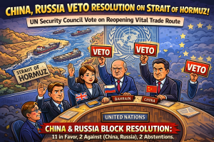 A UN Security Council resolution on reopening the Strait of Hormuz, which had previously been amended to deny Gulf nations permission to use force to defend the vital trade route, was vetoed by China and Russia on Tuesday. There were two votes against, two abstentions, and eleven votes in favor of Bahrain’s proposed resolution.