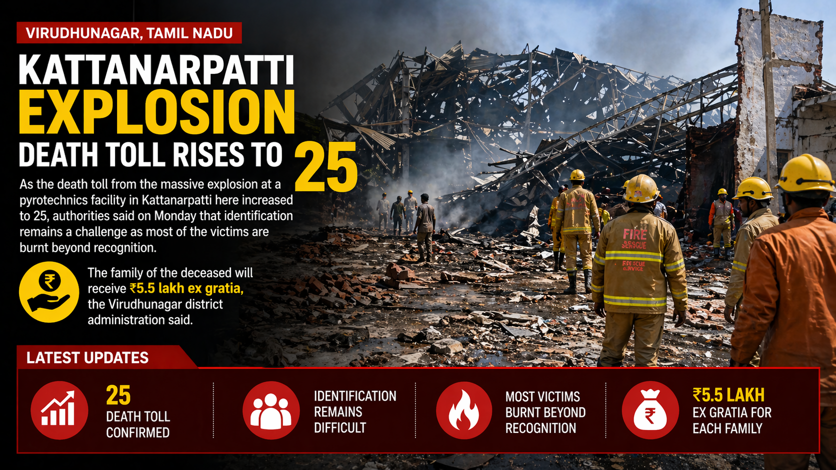 As the death toll from the large explosion at a pyrotechnics facility in Kattanarpatti here increased to 25, authorities stated on Monday that identification is still difficult because the majority of the victims are burned beyond recognition. The family of the dead will receive ₹5.5 lakh ex gratia, according to the Virudhunagar district government.